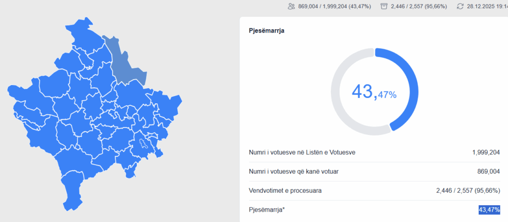 Dalja deri në ora 19:00, 869 mijë apo 43,47% qytetarë shfrytëzuan të drejtën e votës në Kosovë