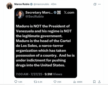Maduro është kreu i Kartelit të Los Soles, një organizatë narkoterroriste që ka marrë nën kontroll një shtet. Ai gjithashtu është i paditur për trafikim të drogës drejt Shteteve të Bashkuara”, ka shkruar Rubio.