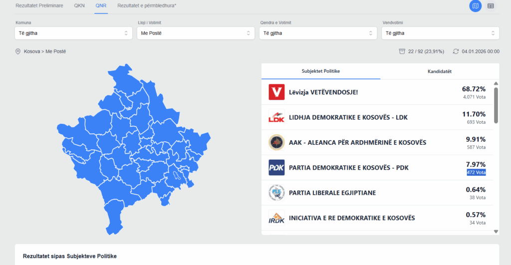 Lëvizja Vetëvendosje, vazhdon të prijë me 68.72%, ose 4,071 vota.