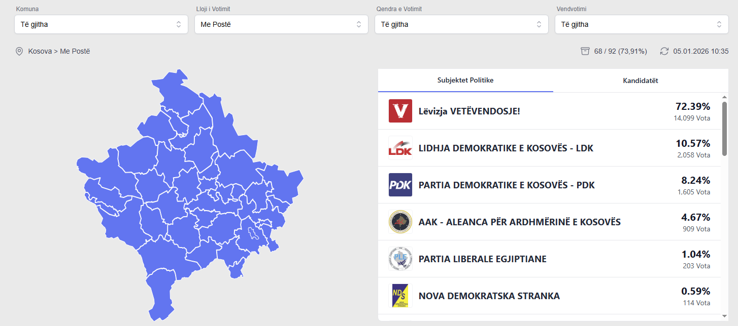 Derisa janë numëruar 73.91% e votave, Vetëvendosje po prin me 72,39%, pas saj LDK me 10.57%, PDK me 8.24% dhe AAK me 4.67%.