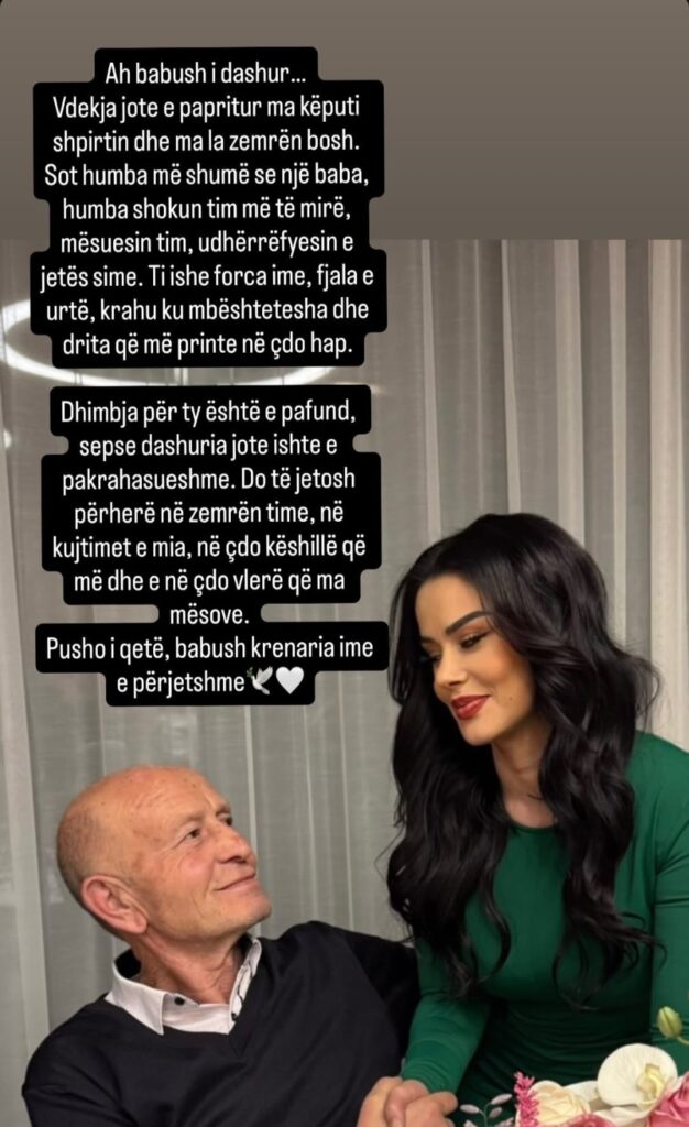 Në fund të mesazhit të saj, këngëtarja shprehet se kujtimi dhe vlerat që ai i ka mësuar do të jetojnë përherë në zemrën e saj. “Pushon i qetë, babush, krenaria ime e përjetshme,” mbyll postimin e saj ajo.